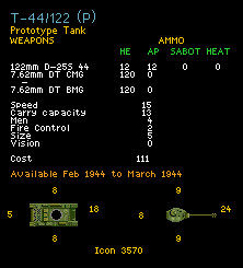 122mmˤ¤Ï¡¢IS-2½ÅÀï¼Ö¤Î122mmD-25Sˤ¤ò²þÎɤ·¤¿122mm D-25-44Tˤ¤Ç¡¢»îºî¼ÖíÒ¤¬´°À®¤·¤Þ¤·¤¿¤¬¡¢ÅëºÜÃÆ¿ô¤¬24ȯ¤È¾¯¤Ê¤¯¡¢ºÎÍѤµ¤ì¤Þ¤»¤ó¤Ç¤·¤¿¡£